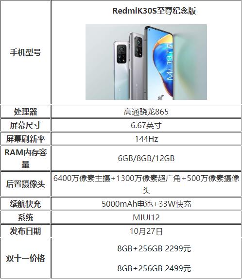 Redmi K30S搭载旗舰骁龙865移动处理平台,配备144Hz刷新率顶级LCD屏幕,6400万像素超清三摄,内置X轴线性马达以及立体声双扬声器,是Redmi为米粉打造的双十一特供硬核旗舰。Redmi K30S至尊纪念版售价2599元起,11.11期间特供300元补贴,到手价2299元起,11月1日正式发售。