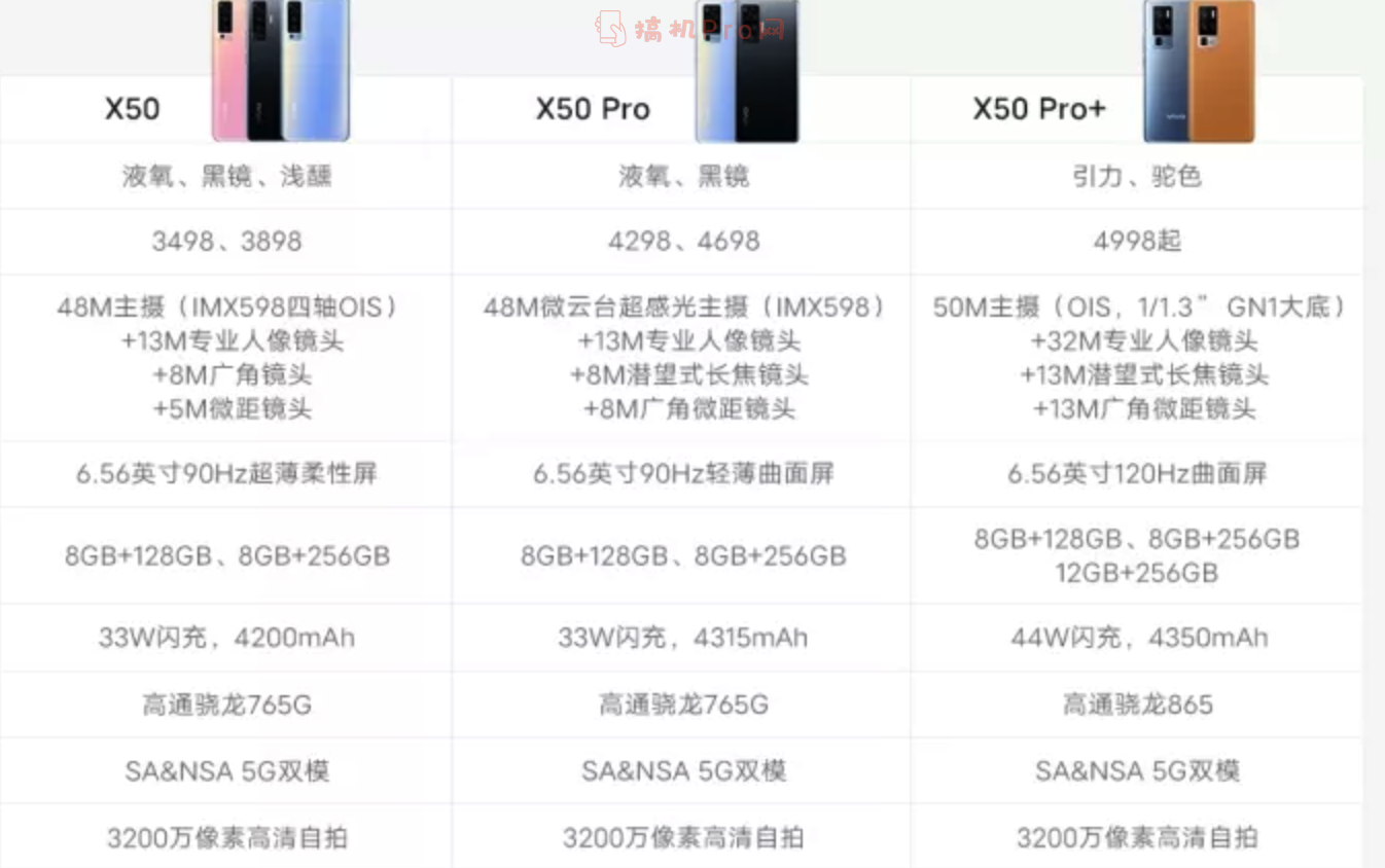 该系列全系配备了6.56英寸AMOLED柔性屏,支持P3全色域,峰值亮度高达1300nit,搭载HDR 10+ 技术,刷新率为90Hz(X50 Pro+为120Hz),触控采样率也有180Hz,虽无亮点,也算中规中矩。