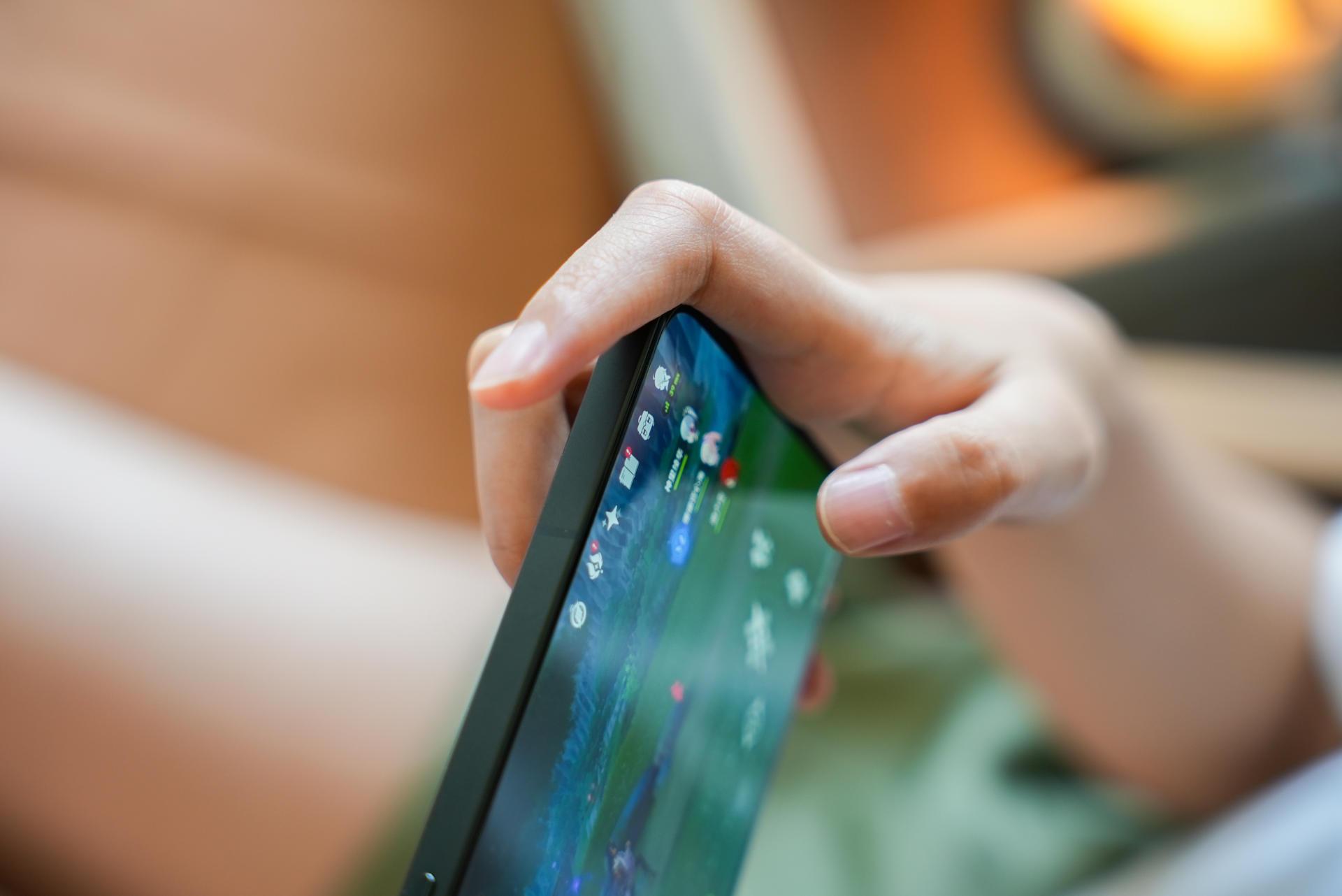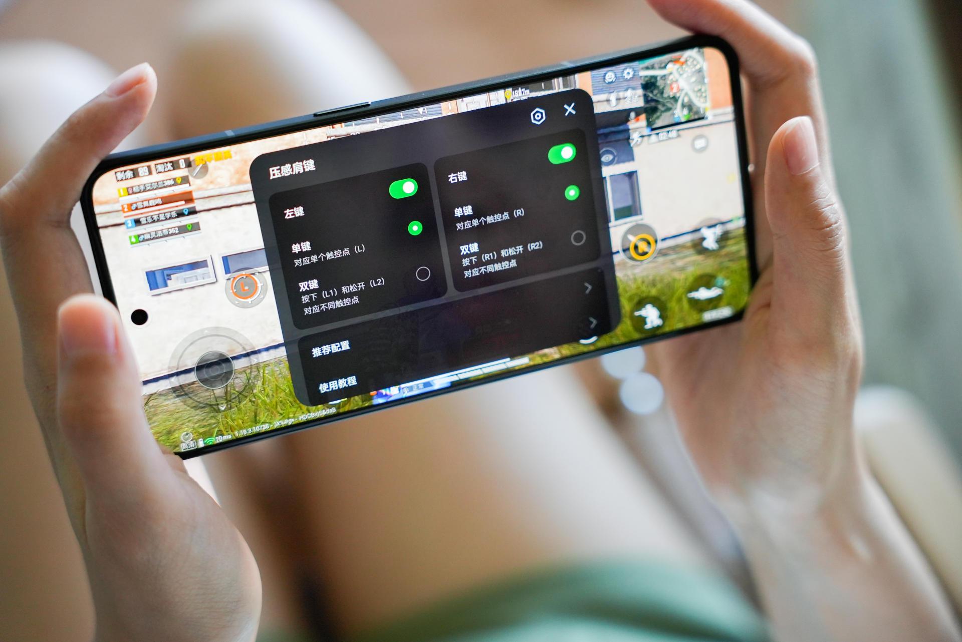GT2大探的日常触控采样率120Hz,游戏中变为360Hz,右侧边框处设置了两颗隐藏式压感肩键,让玩FPS射击类游戏有更棒的体验,比如流行的《和平精英》,使用这部手机就不用再像普通手机那样四指在屏幕上操作。