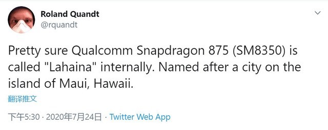 根据推特上的@Roland Quandt透露的消息来看,高通骁龙875(SM8350)的内部代号为Lahaina。据悉,Lahaina是位于美国夏威夷群岛茂宜岛最西端,夏威夷王国故都。