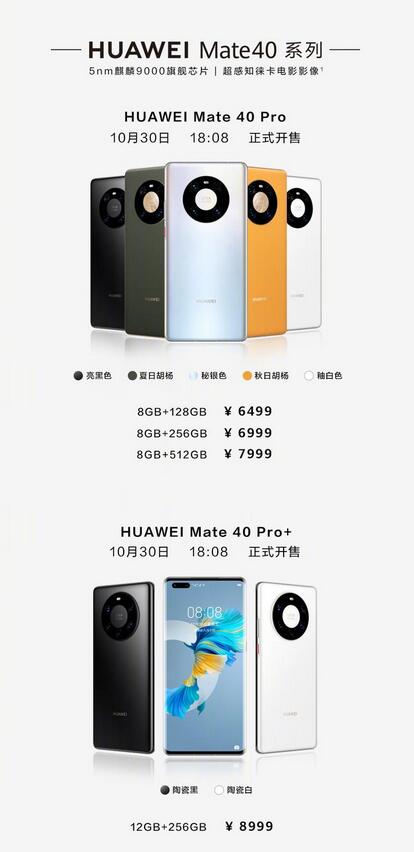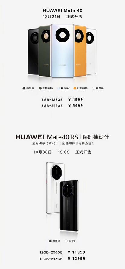 其中,Mate40(8G+128G)售价为4999元,Mate40(8G+256G)售价为5499元。HUAWEI Mate 40 Pro售价6499起,Mate 40 Pro+售价8999起, Mate 40 RS 保时捷设计售价11999起。