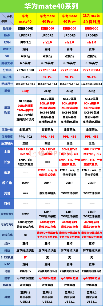 mate40不同型号之间配置对比
