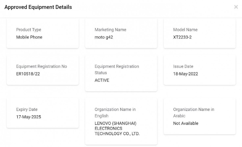 摩托罗拉正在开发一款新的廉价G系列手机,名为MotoG42。营销名称已通过TDRA认证正式确认。这也显示了手机的型号为XT2233-2。除TDRA外,该手机还通过了包括BIS、FCC和EEC认证网站在内的认证,这表明该手机即将在印度推出。Moto G42将取代Moto G41,成为Moto G52更便宜的替代品。据说Moto G42有一个“HawaiiPlusOLED22”的代号,这很好地表明它将有一个OLED面板。
